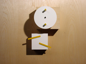 Ambient Box The ambient box moves in response to sound and light levels in its environment. A microphone attached to the front of the circular panel constantly monitors the sound level in the room and moves a motor attached to this panel quickly if there is a sudden change in the volume and slowly if the change is slight. The yellow rectangles on the bottom box are each attached to solar motors which release their energy as circular motion. |