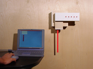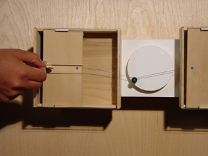 Remote Box The movement of the remote box is controlled by a microcontroller and the interaction is through a networked java application. A person can send a stimulus to the box by manipulating an abstract digital interface on a computer screen which sends a signal over a computer network. This stimulus triggers a motor inside the box and the time difference between signals determines the speed and rhythm of another motor which turns the wires on the face of the box. |