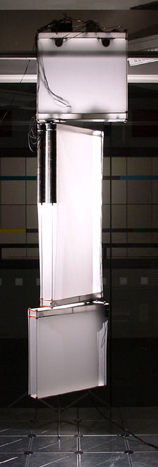 Trundle is a behavioral sculpture -- an abstraction of a biological system. It interacts with its environment through an array of sensors and motors. The origins of Trundle lie in the work of Mid-century kinetic sculptors Lazlo Moholy-Nagy, Vassilakis Takis, and Nicolas Schoffer, scientists such as H. Ross Ashby and W. Grey Walter and current research in behavioral robotics. Trundle is a focused study of movement and interaction in physical space. As people move through the environment, Trundle responds by changing its direction and orientation. The way Trundle responds is the result of its programmed behavior. Detailed information about Trundle can be found in the thesis Behavioral Kinetic Sculpture. |
